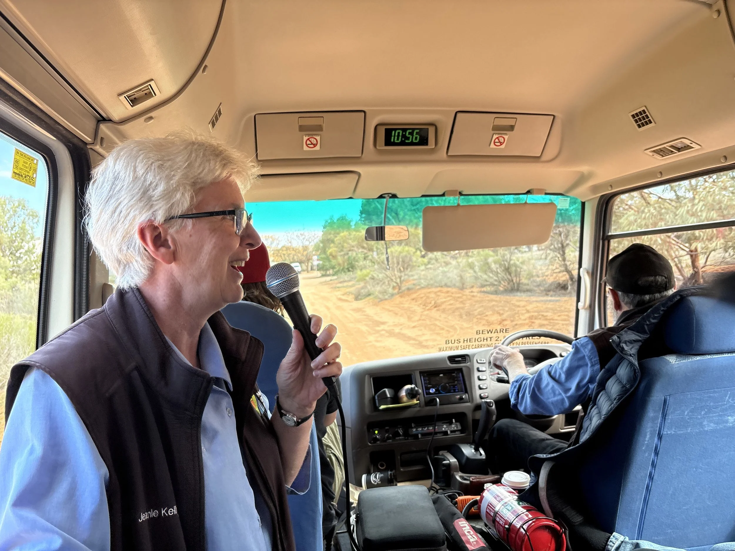With rain forecast for 3pm, GreenConnect Mildura participants cheerfully set off on a day trip through the Millewa farming region, visiting Werrimull before heading to Lock 9 for a riverside lunch. Our experienced Murray Offroad guides greeted us at the Mildura Wharf with a comfortable 25-seater bus, having already kindly picked up two participants from home—both no longer able to drive.